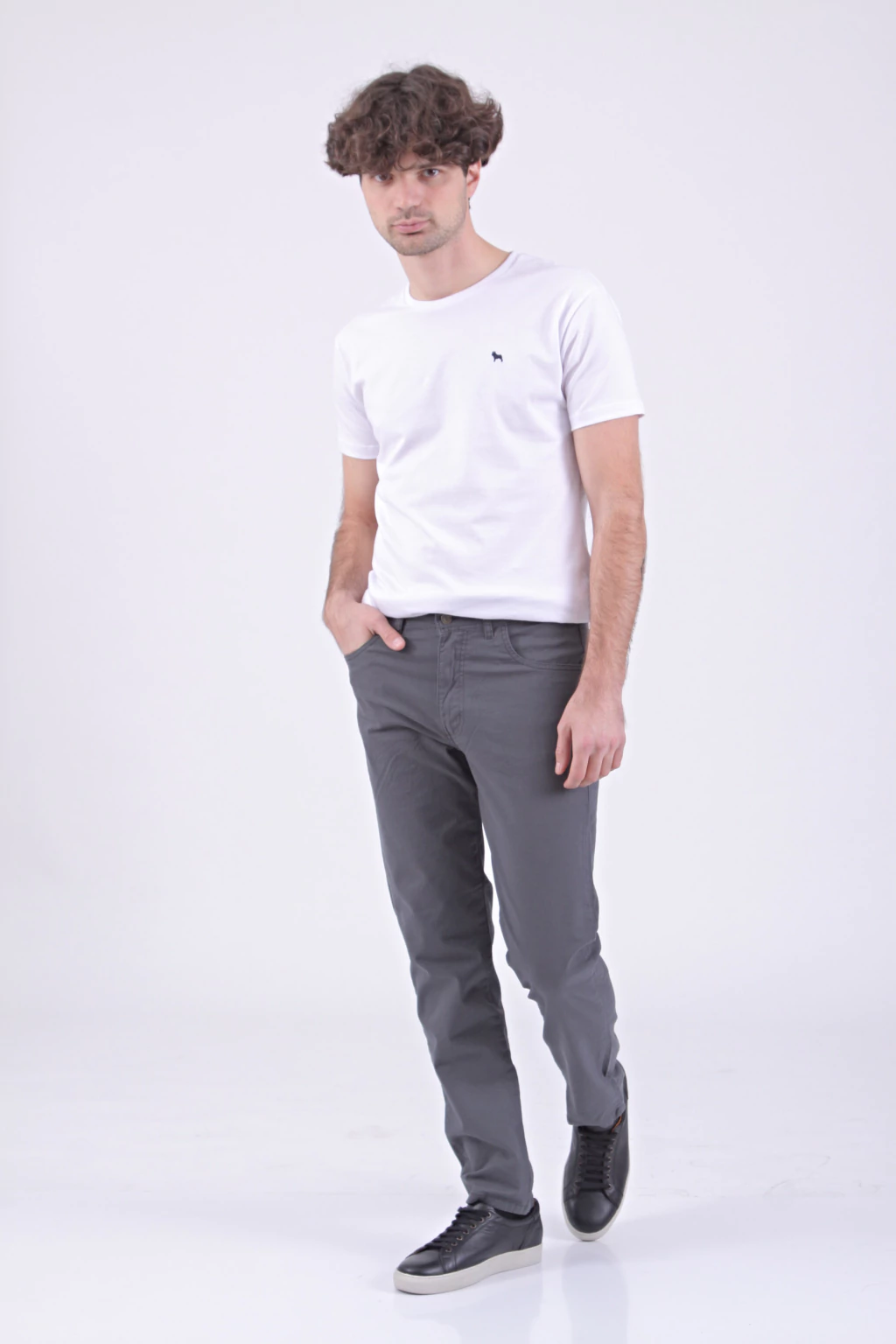 Confeccionado en gabardina elastizada de 7oz, este pantalón regular fit de corte recto está compuesto por 98% algodón y 2% elastano, garantiza elasticidad y comodidad.